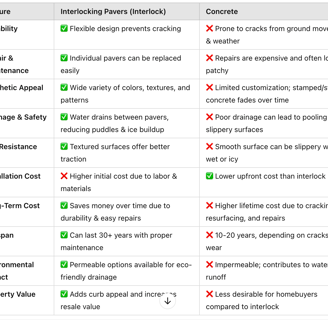 While concrete may be cheaper upfront, it comes with a higher risk of cracks, costly repairs, and limited design flexibility. Interlocking pavers, on the other hand, offer: